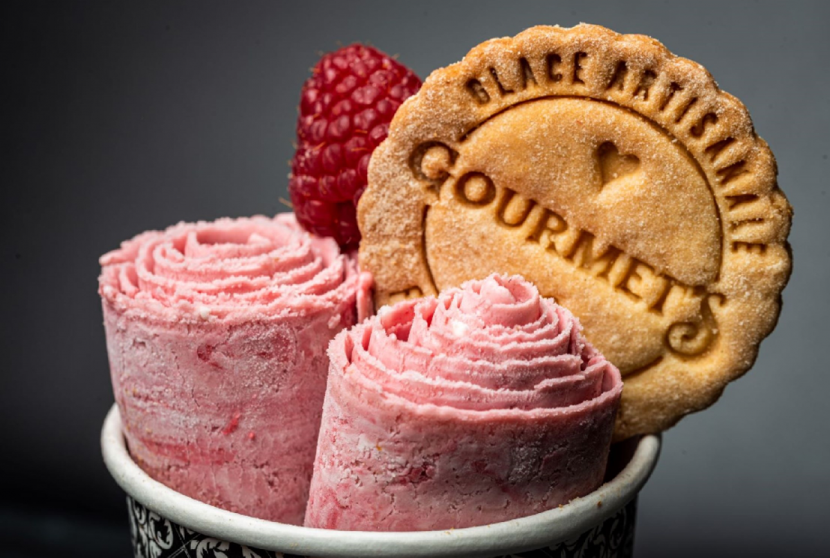 Les glaces sont réalisées à la minute, sous les yeux de tous, directement sur le plateau givré de la plancha. A son contact, tous les ingrédients des recettes surgèlent et grâce à un savant jeu de spatules, nous réalisons des petits rouleaux de glaces.