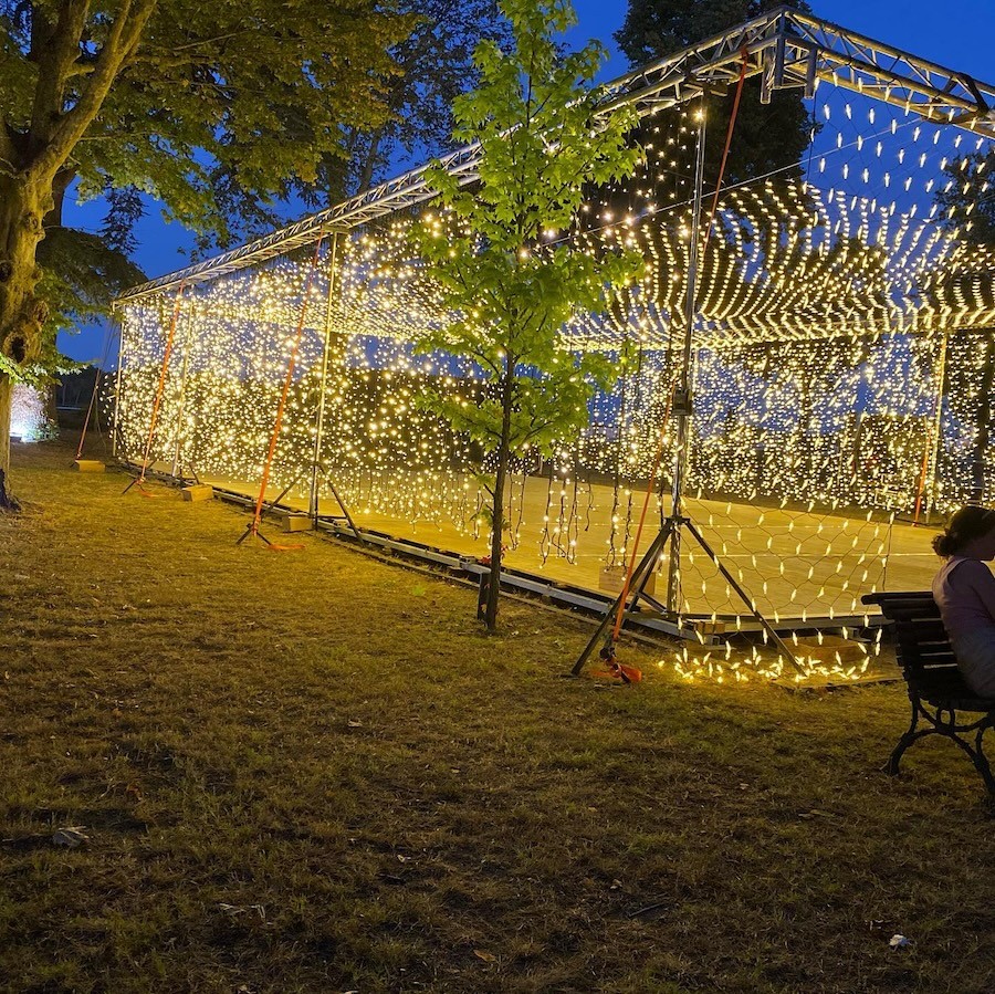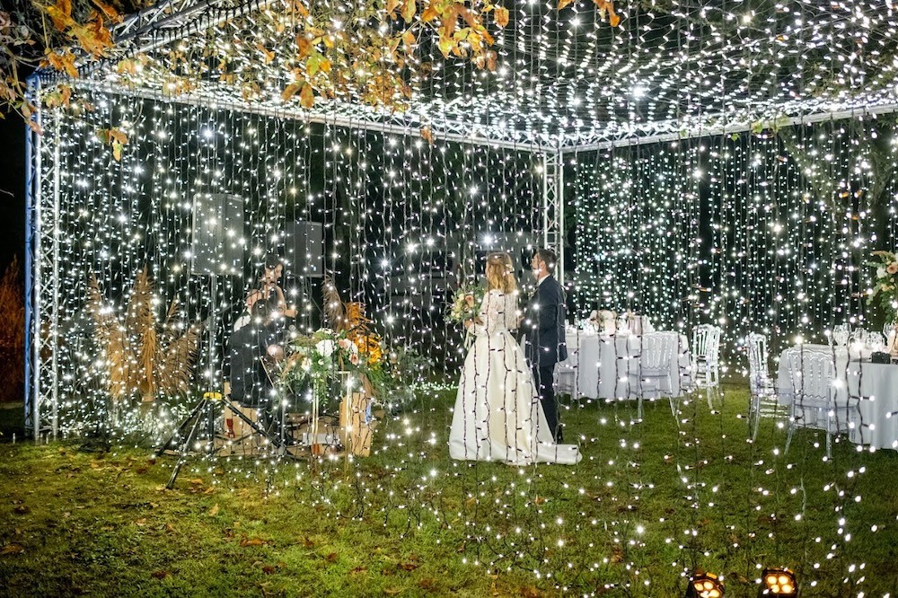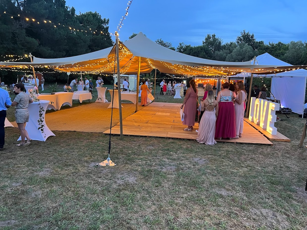 Pas de salle ce n’est pas un problème. Nous vous proposons plusieurs solutions; l’ambiance conte de fées avec notre cube lumineux, l’ambiance bohème avec nos guirlandes guinguettes ou encore un ciel étoilé et depuis cette année, la location de tente stretch et son éclairage tamisé.